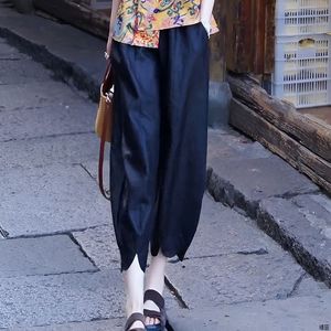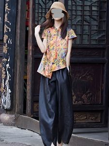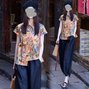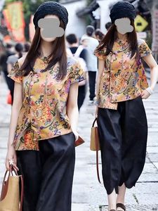 新しい中国風の女性用スーツ、夏用プラスサイズファットmm斜め襟シャツ、ワイドレッグパンツ、気質と年齢を軽減する2点セット