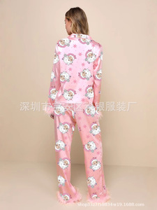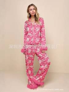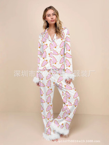 欧美亚马逊独立站跨境女装圣诞节缎面印花休闲长袖长裤睡衣套装