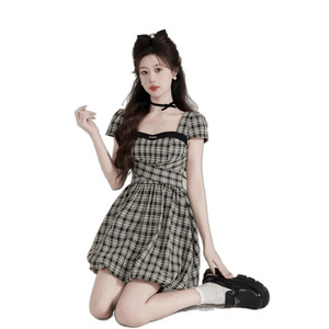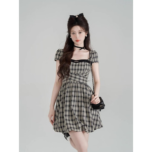 カレッジスタイルの甘いフレンチスクエアカラーチェック柄ドレス、小柄な人向けのウエスト痩身デザイン、ニッチなチュチュスカート、トレンディ