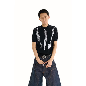 ノーブランドの新しいファッショナブルなスカルナイフ、フォーク、スプーンジャカード半袖セーターシンプルでトレンディな日本の人気のレイジー