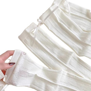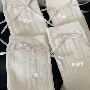 蝶結び薄手ロリータミッドカーフソックス、サイドリボン、ラブハート中空メッシュソックス、クリーム春夏パイルソックス