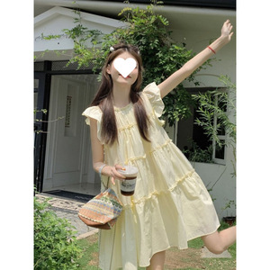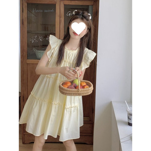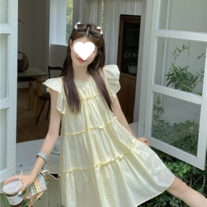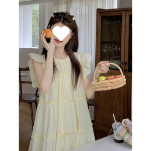 ライトイエローの韓国風甘い気質スリムベビードールスカート2025年夏新作レディース半袖ドレス