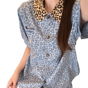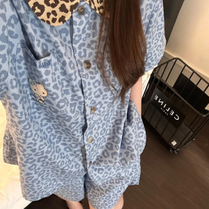 キティブルーヒョウ柄テンセルコットンパジャマ女性用夏半袖ショーツガーリーウェアラブルホーム服セットブラウン