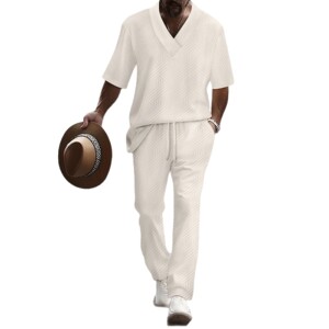 2025 アマゾンクロスボーダー新ヨーロッパとアメリカのメンズカジュアル半袖ズボンハートネック無地多用途ジャカードサマースーツ
