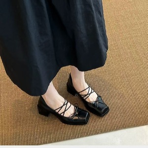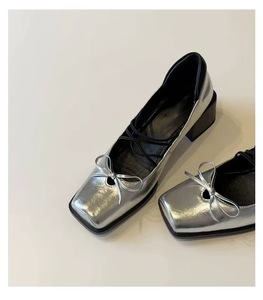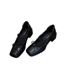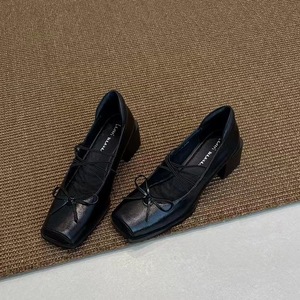 スクエアトゥ 2025 春と秋の新作女性用シングルシューズ太いヒール豚鼻本革リボンミッドヒールバレエシューズ