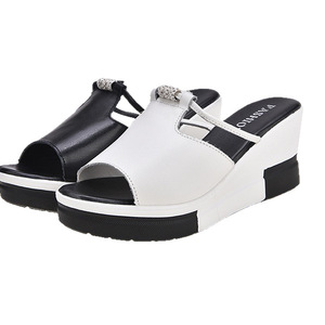 女性用の新しい夏のサンダル、夏の本革のラインストーンウェッジヒールプラットフォームサンダル、女性用のファッショナブルで多用途な厚底ビーチサンダル