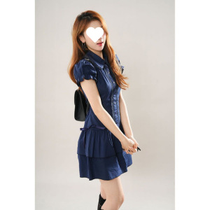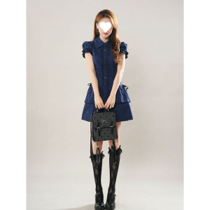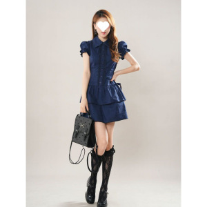 レトロなカレッジスタイルのレースステッチブルーレトロシャツドレスヴィンテージスタイルのショートスカート2025新しいスタイル