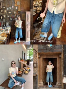 Ouyang 6/16 20:00 【カクカガール】クロップドジーンズ ゆったりワイドストレートミドルパンツ