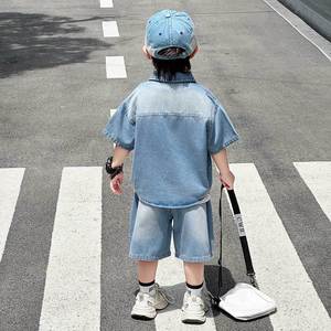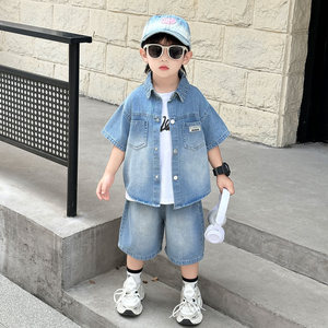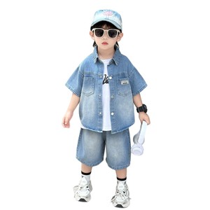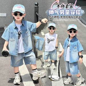 子供服男の子夏デニム半袖シャツスーツ 2025 新しい子供のインターネット有名人ストリート 3 点セット服トレンディ