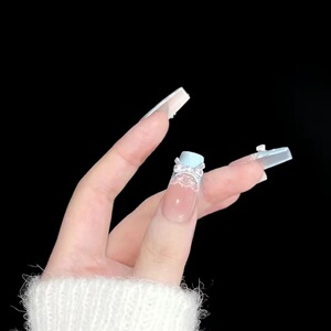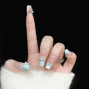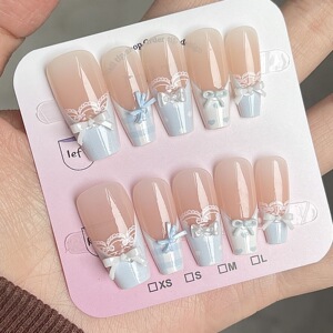 蓝色法式蕾丝花边手工穿戴甲清新显白蝴蝶结美甲可拆卸指甲贴片