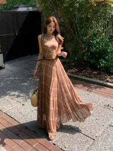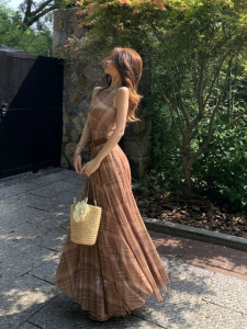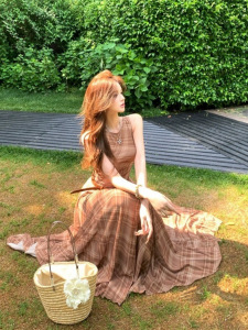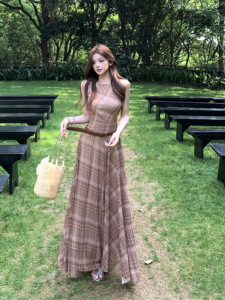 レトロチェック柄ノースリーブベストドレス女性の夏のリゾートスタイルスリムフィットスカートハイウエストスカートAラインロングスカート