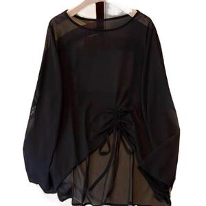 薄い微透けブラックシフォン長袖Tシャツレディース夏大きいサイズファットmm日焼け止めブラウス不規則な巾着トップ