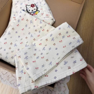 春夏の新アメリカンホワイト漫画キティ猫リボン花柄ジーンズ女性のワイドレッグストレートパンツトレンディ