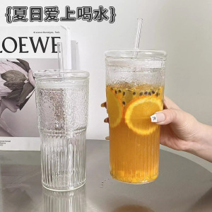 ins 大容量ストローカップ蓋付きストライプガラスドリンクカップ高価値コールドドリンクジュースコーヒーカップウォーターカップ
