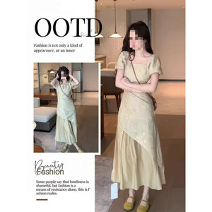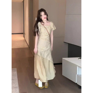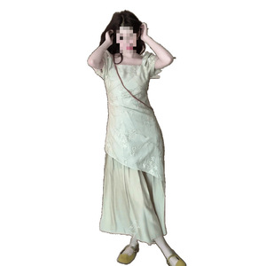 新しい中国風のレースアップウエストパフスリーブドレス女性のための 2025 夏の新しいデザイン不規則な刺繍ロングスカート
