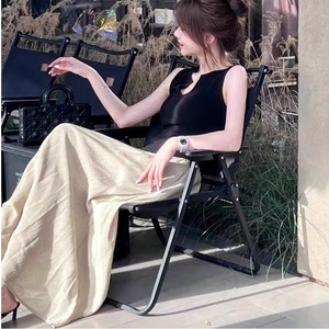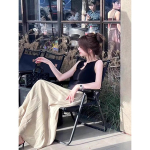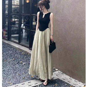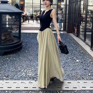 おしゃれなレディース洋風スーツ、ノースリーブベストトップ、裾が大きくドレープ感のあるハーフ丈スカート、ツーピーススーツ、夏にスリムに見えます
