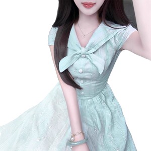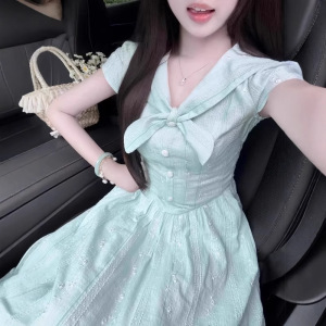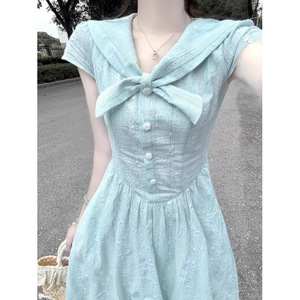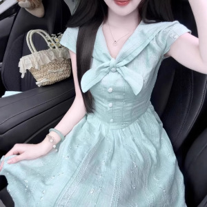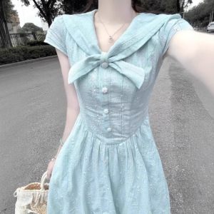 女性のための小さな新鮮なブルーネイビーカラー半袖ドレス 2025 夏の美しいピンチウエスト A ラインロングドレス