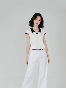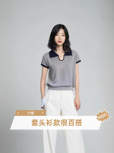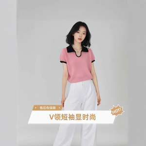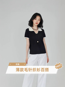 2025年新作夏スタイル、ラペルカラー、コントラストカラー、半袖ニット、スリムで多用途、カジュアルレディースファッション、クロスボーダー、ドロップシッピング対応