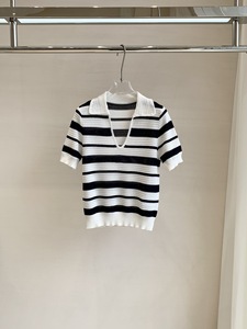 Nanyou 高品質の女性のセーター MOCO25 新しいポロ襟ストライプ半袖セーター 25083