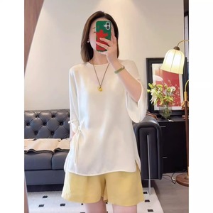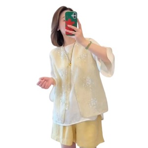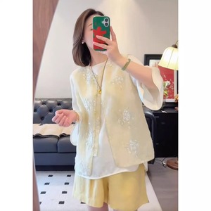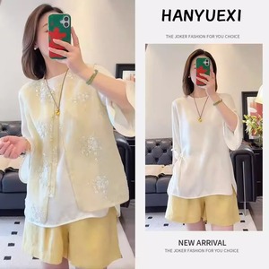 太った女の子は、新しい中国風の刺繍入りベスト、ルーズトップ、ショーツスーツの女性の夏の新しいスタイルのセットを着用しています。