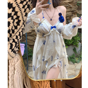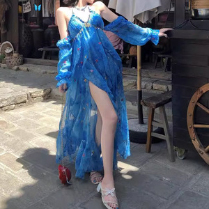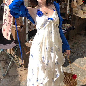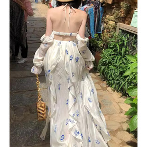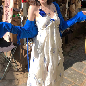 ZHOYUE「アイスブロークンブルーアイリス」サマーブルーローズバックレスサスペンダースカート取り外し可能な袖ホルターネックプリントブレンド