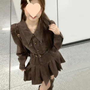 ブラウンメイラードレトロ長袖デニムドレス女性のための 2025 新作春ウエスト痩身プリーツスカート