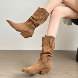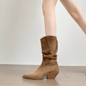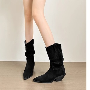 2025秋冬新作スエードポインテッドトゥウェッジヒールミッドヒールショートブーツミッドカーフブーツハイヒールパイルブーツウエスタンカウボーイブーツ