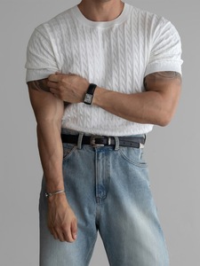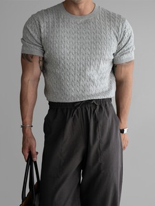 ラウンドネック麻柄ニット半袖Tシャツメンズ夏スリムアイスシルク薄いストライプTシャツストレッチトップトレンディ