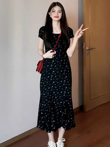 大码法式温柔碎花连衣裙女夏季新款微胖显瘦长裙气质收腰鱼尾裙