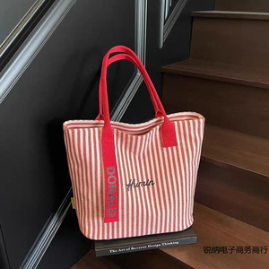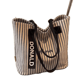 夏ストライプキャンバスバッグ女性のための 2025 新しい大容量クラスのハンドバッグ韓国スタイルのショルダー通勤トートバッグ
