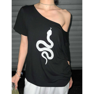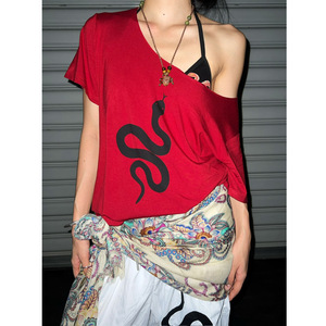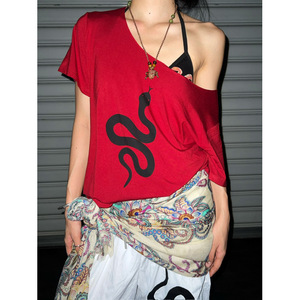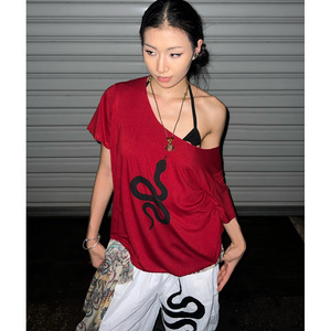 蛇形hiphop街舞嘻哈复古露肩短袖女美式显瘦上衣宽松印花爵士纯欲