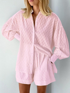 2025 夏のヨーロッパとアメリカの女性のシャツジャカードパフスリーブ気質トップショーツ通勤デザインカジュアルスーツ