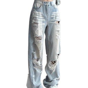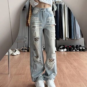 アメリカンレトロなリップドジーンズ、夏の新しいデザイン、ハイウエスト、ルーズ、スリム、ワイドレッグフロアレングスパンツ、トレンディ