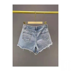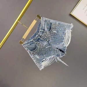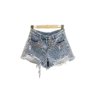女性用リップドデニムショートパンツ、トレンディな2025年新作夏ハイウエストスリムヨーロッパステーションダイヤモンド付きローエッジワイドレッグホットパンツ