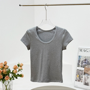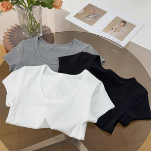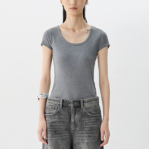 JNBY/25夏新作 シンプルベーシックリブスリム万能Tシャツ Uネック無地クラシック3色着痩せ半袖