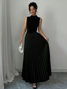 女士纯色立领百褶裙无袖优雅长款女装连衣裙