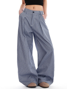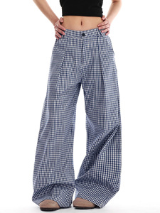 2025 新しいプリーツブルーチェック柄パンツ薄いカジュアルパンツ女性の夏アメリカンスタイルのリラックスしたルーズワイドレッグパンツ