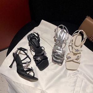 韓国スタイルの女性用ハイヒール 2025 夏の新しいスタイルのスティレットヒール多用途スクエアトゥオープントゥワンラインバックルラインストーンサンダル