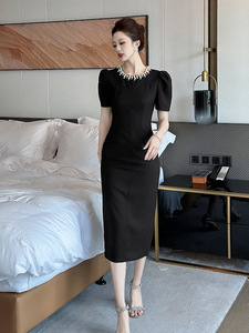 2025 新しい夏の女性のフレンチパールラウンドネックウエスト膝上黒ミッドレングスヘップバーンスタイルドレス 9009