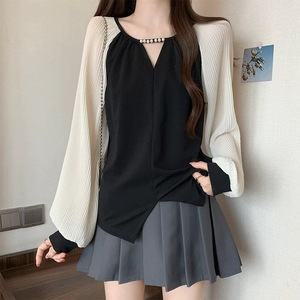 軽くて高級感のあるフレンチビーズカラーレディース長袖シャツ春秋アウター大きいサイズファットラグランスリーブプリーツスリーブトップス