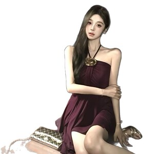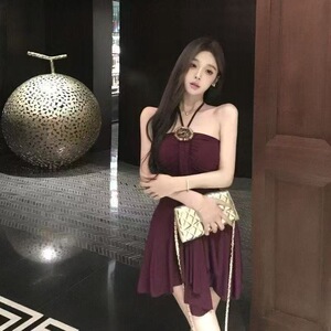 パープルヘビーデューティーホルターネックサスペンダーチューブトップドレス女性の夏のフレンチ社交界の気質プリーツウエスト痩身スカート