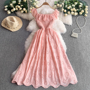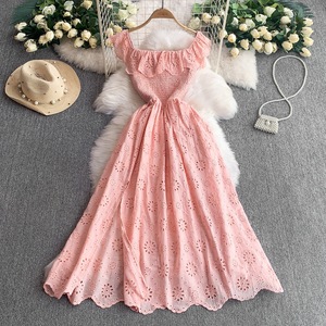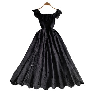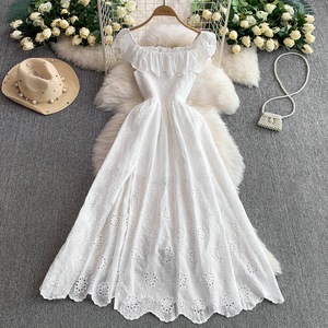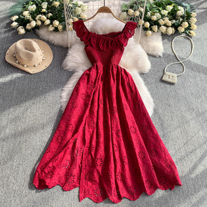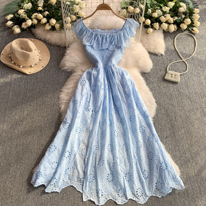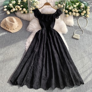 ホリデースタイルかぎ針編み中空フリルワンショルダードレス女性の夏の弾性ウエスト痩身スリットロングスカート