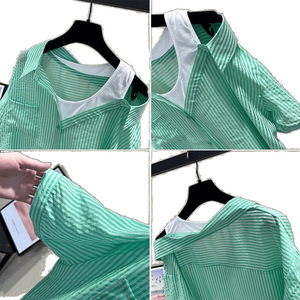 ストライプオフショルダーパッチワーク半袖シフォンシャツレディーストップスデザインニッチファッション外国風年齢軽減シャツ