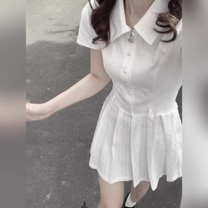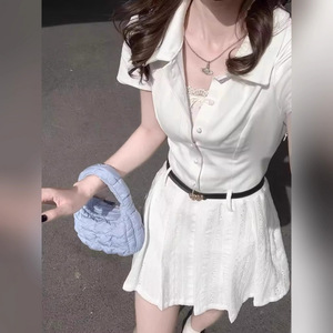韓国カレッジスタイルポロカラーホワイトシャツドレス女性のための夏のプチハイエンドウエストAラインスカート