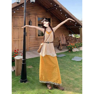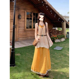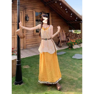 新しいホリデースーツ中空ロングスカートベストブラウスサスペンダーサマードレスベルトツーピースセット