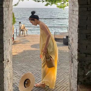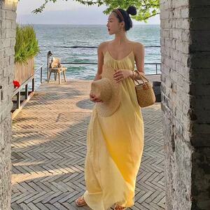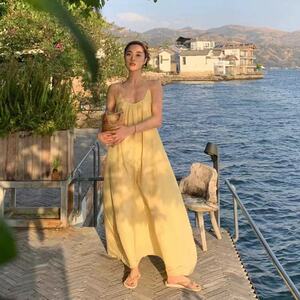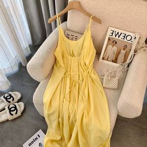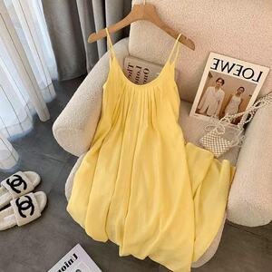 新しいフレンチイエローサスペンダードレス女性の夏のドーパミンルーズ妖精ロングドレススカートロング