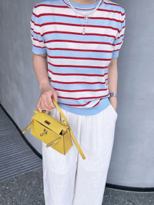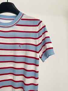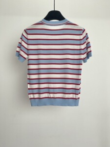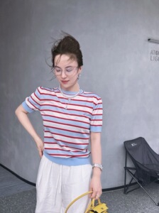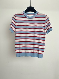 P's ハイグレードセレブ同風赤青白ストライプレタージャガードラウンドネック半袖セータートップス女性用