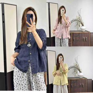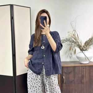 2025 夏韓国語バージョンルーズシンプルなリネンネックライン手縫いラウンドネック日焼け止めシャツカーディガン多用途シャツ女性のための