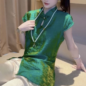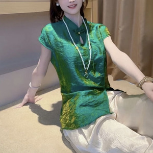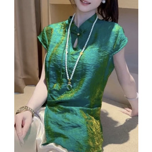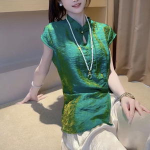 サファイアグリーンの新しい中国風国民風2025夏気質グリーンデザインスリムフィット外国風年齢軽減薄いグリーンTシャツ