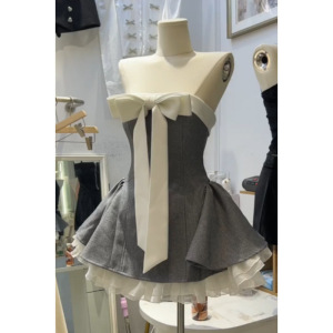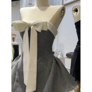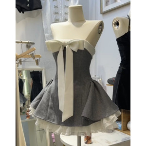 フレンチコントラストカラーステッチリボンチューブトップドレス夏の新しい気質ウエスト痩身ふわふわショートスカート女性用